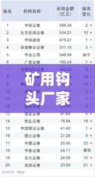 本文介绍了矿用钩头厂家排名前十名及部分厂家的简要介绍,以便读者更好地了解市场并选择适合自己的合作伙伴,在选择矿用钩头厂家时,需要注意产品质量、生产工艺、服务水平和价格等因素,优质的矿用钩头厂家可以提供高品质的产品和良好的服务,为矿业生产效率和安全提供有力保障,建议读者在选择矿用钩头厂家时,进行充分的调查和比较,选择最适合自己的合作伙伴,也建议各矿用钩头厂家加强技术研发和品质控制,提高产品竞争力,为客户提供更优质的服务。