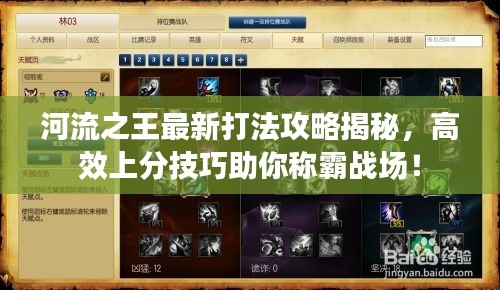 河流之王是游戏中一位非常强大的英雄角色,掌握其最新打法技巧对于提升游戏水平至关重要,本文将为大家带来河流之王的最新打法技巧攻略,帮助玩家更好地掌握这位英雄,从而在游戏中取得更好的成绩。